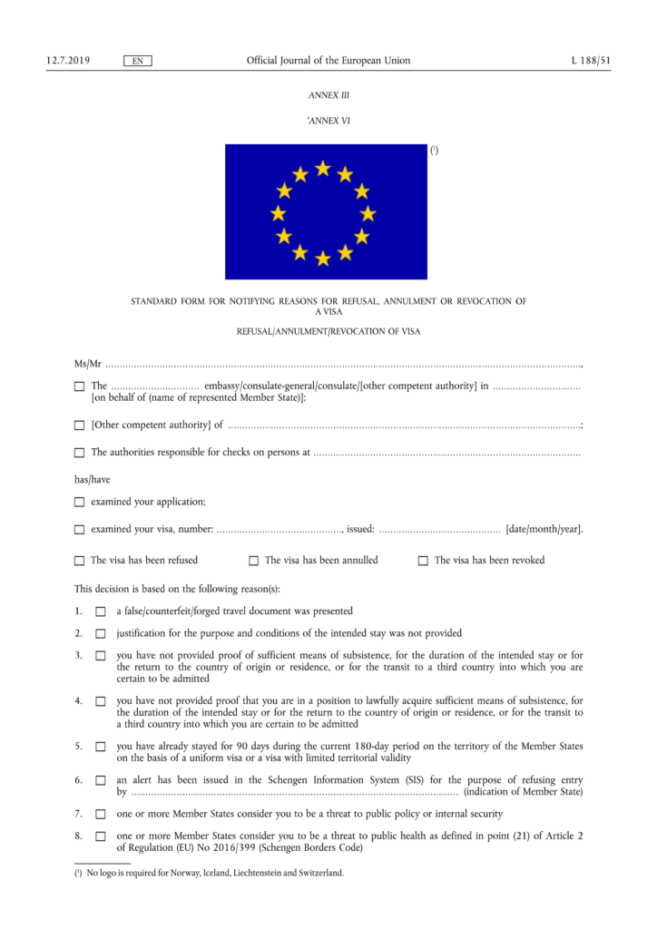 Since the recent February 2020 reform of the Schengen Visa Code, the standard rejection form should always look similar to this: